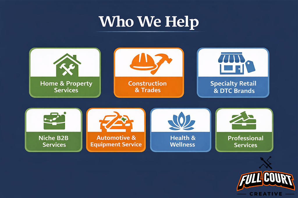 Full Court Creative works best with service-based businesses and growth-minded brands that want to turn more clicks, calls, and referrals into real business growth. We support companies that need stronger visibility, better conversion, and a more consistent path from attention to leads, sales, and booked work.